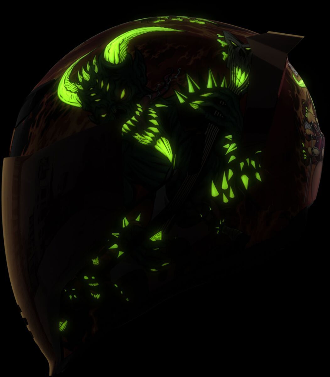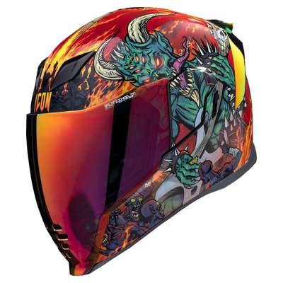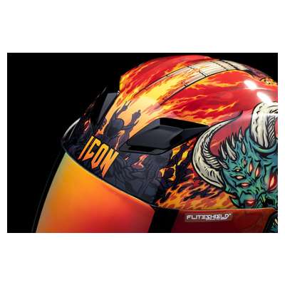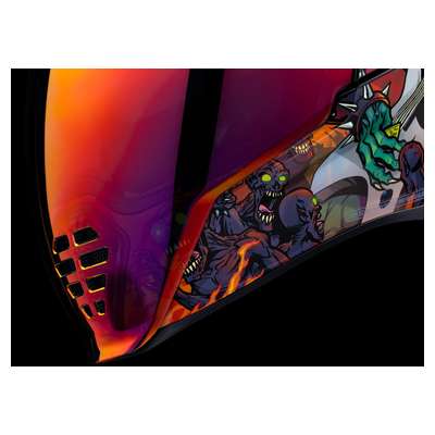 Airflite™ Blegh MIPS® HelmetRemovable molded breath deflector and chin curtain Injection molded polycarbonate shell for strength Fog-Free Dropshield™ with exterior switch Recessed twin channel supervent cooling system Multiple oversized intake and exhaust ports Quick-change Fog-Free Fliteshield™ with side plates The Dropshield™ visor must only be used while the main face shield is in the fully closed position Removable Hydradry™ moisture wicking liner Glow in the dark Internal speaker pockets work with ICON's R.A.U. Bluetooth device Includes Clear & RST Sunset fog-free Fliteshield™