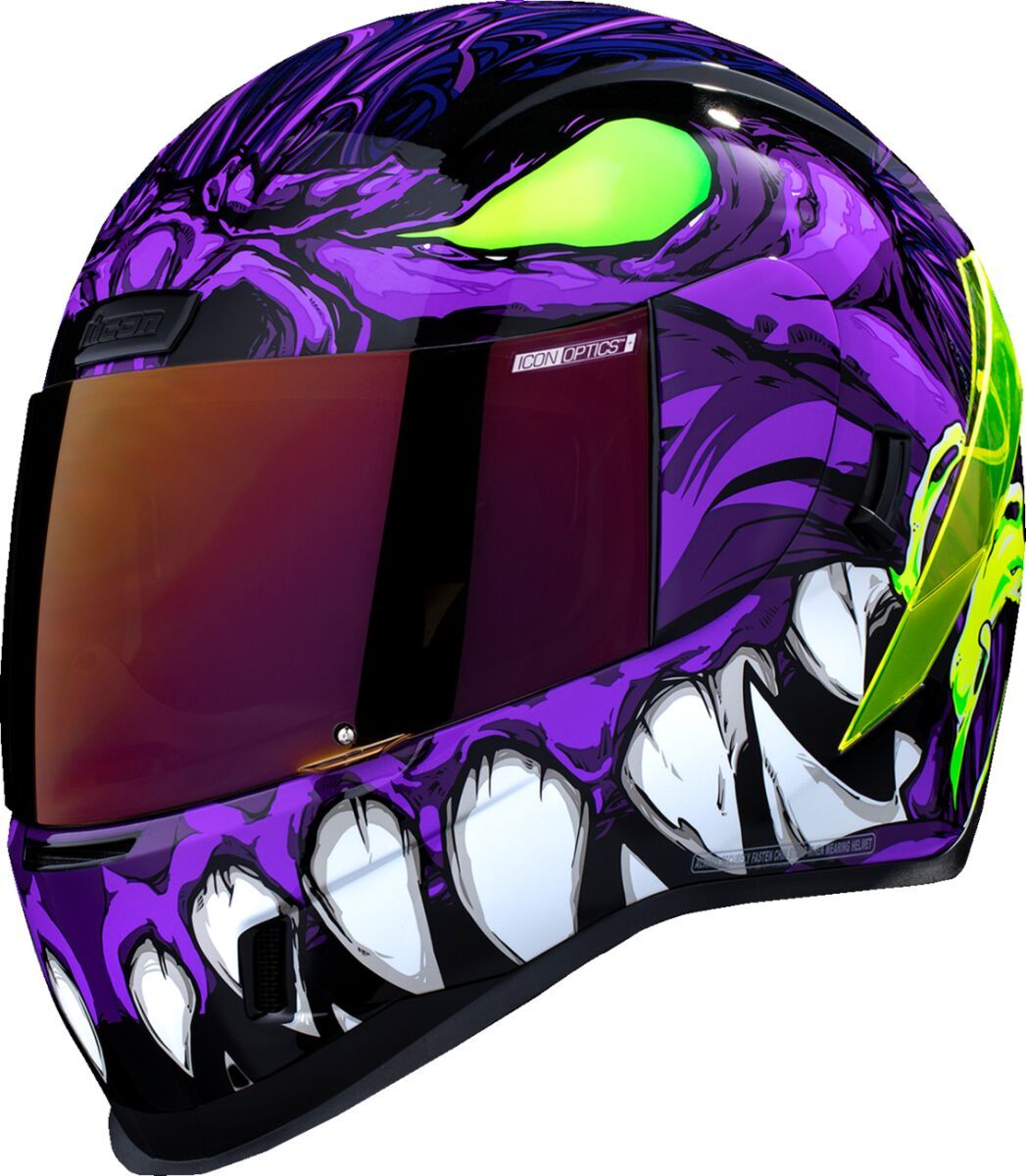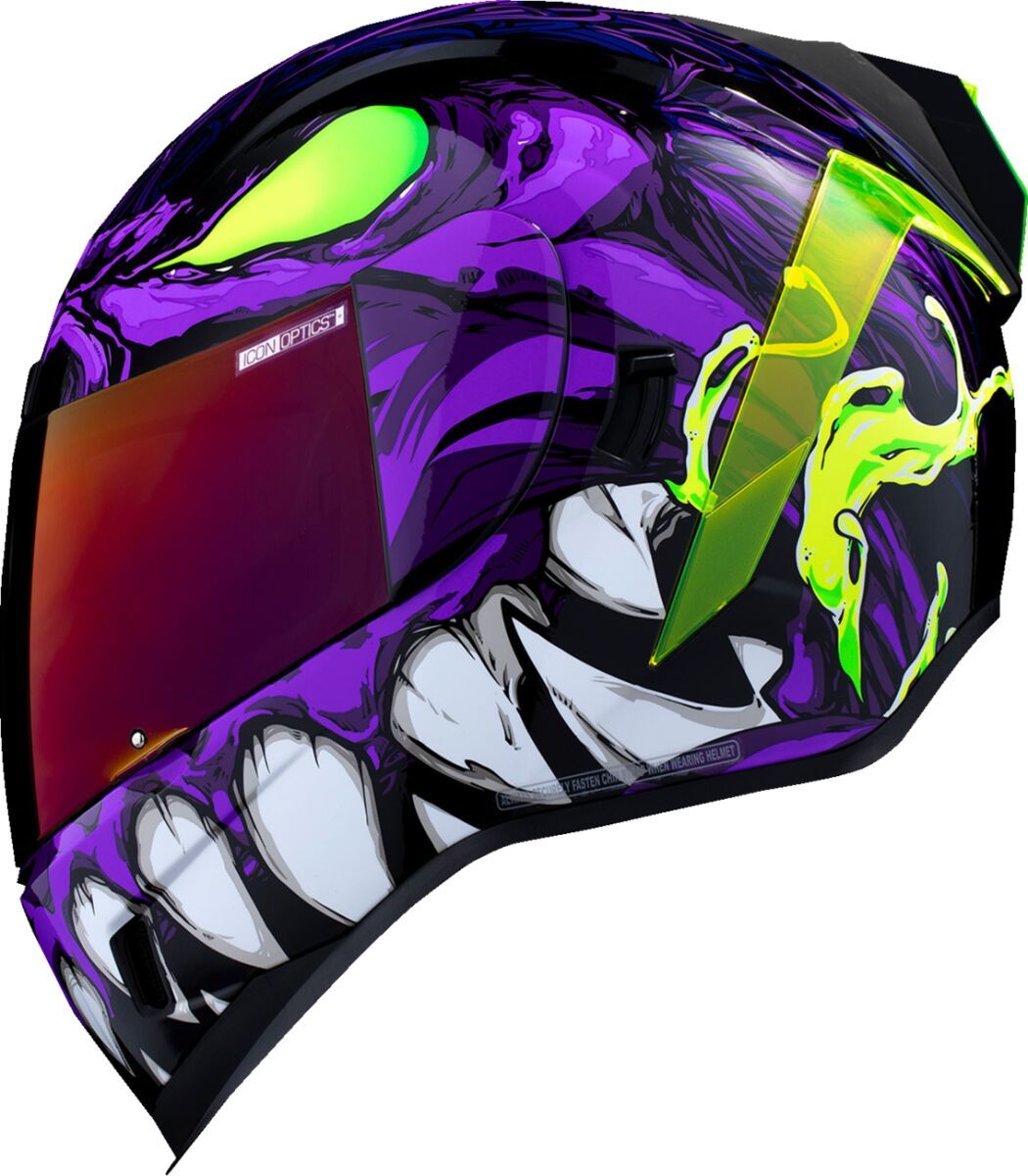 Airform™ Manik'RR MIPS® HelmetContinuous venting system Fog-free ICON Optics™ Shield with Rapid-Release™ System Injection molded polycarbonate shell for strength Internal airflow geometry Sculpted neck roll Prolock™ positive shield locking system Removable molded breath deflector The Dropshield™ visor must only be used while the main face shield is in the fully closed position Internal Dropshield™ with exterior switch Removable Hydradry™ 3-piece moisture wicking liner Internal speaker pockets work with ICON's R.A.U. Bluetooth device Includes Dark Smoke DropShield™ and Rubatone Black Speedfin™ Includes Clear & Purple RST Optics™ ShieldsSpeedfin™ includes Green DayGlo Insert