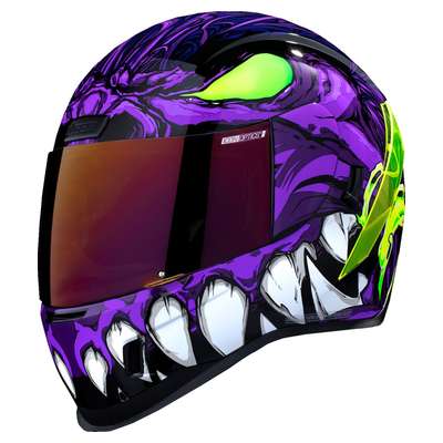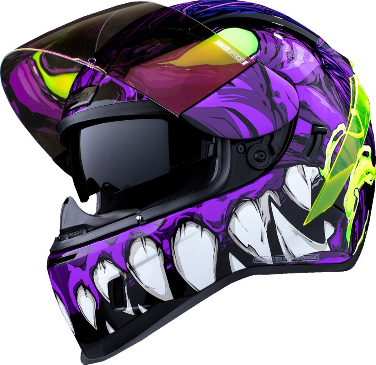 Airform™ Manik'RR MIPS® HelmetContinuous venting system Fog-free ICON Optics™ Shield with Rapid-Release™ System Injection molded polycarbonate shell for strength Internal airflow geometry Sculpted neck roll Prolock™ positive shield locking system Removable molded breath deflector The Dropshield™ visor must only be used while the main face shield is in the fully closed position Internal Dropshield™ with exterior switch Removable Hydradry™ 3-piece moisture wicking liner Internal speaker pockets work with ICON's R.A.U. Bluetooth device Includes Dark Smoke DropShield™ and Rubatone Black Speedfin™ Includes Clear & Purple RST Optics™ ShieldsSpeedfin™ includes Green DayGlo Insert