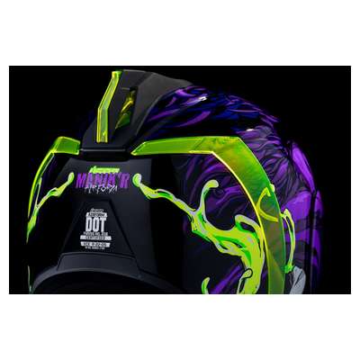 Airform™ Manik'RR MIPS® HelmetContinuous venting system Fog-free ICON Optics™ Shield with Rapid-Release™ System Injection molded polycarbonate shell for strength Internal airflow geometry Sculpted neck roll Prolock™ positive shield locking system Removable molded breath deflector The Dropshield™ visor must only be used while the main face shield is in the fully closed position Internal Dropshield™ with exterior switch Removable Hydradry™ 3-piece moisture wicking liner Internal speaker pockets work with ICON's R.A.U. Bluetooth device Includes Dark Smoke DropShield™ and Rubatone Black Speedfin™ Includes Clear & Purple RST Optics™ ShieldsSpeedfin™ includes Green DayGlo Insert