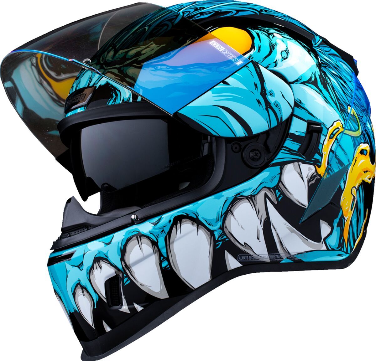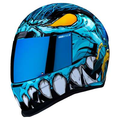 Airform™ Manik'RR MIPS® HelmetContinuous venting system Fog-free ICON Optics™ Shield with Rapid-Release™ System Injection molded polycarbonate shell for strength Internal airflow geometry Sculpted neck roll Prolock™ positive shield locking system Removable molded breath deflector The Dropshield™ visor must only be used while the main face shield is in the fully closed position Internal Dropshield™ with exterior switch Removable Hydradry™ 3-piece moisture wicking liner Internal speaker pockets work with ICON's R.A.U. Bluetooth device Includes Dark Smoke DropShield™ and Rubatone Black Speedfin™ Includes Clear & Blue RST Optics™ ShieldsSpeedfin™ includes Blue DayGlo Insert