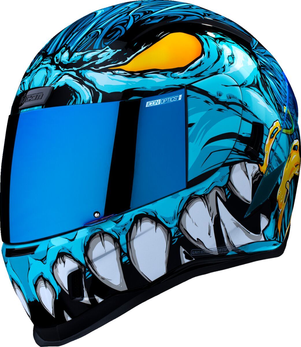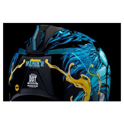 Airform™ Manik'RR MIPS® HelmetContinuous venting system Fog-free ICON Optics™ Shield with Rapid-Release™ System Injection molded polycarbonate shell for strength Internal airflow geometry Sculpted neck roll Prolock™ positive shield locking system Removable molded breath deflector The Dropshield™ visor must only be used while the main face shield is in the fully closed position Internal Dropshield™ with exterior switch Removable Hydradry™ 3-piece moisture wicking liner Internal speaker pockets work with ICON's R.A.U. Bluetooth device Includes Dark Smoke DropShield™ and Rubatone Black Speedfin™ Includes Clear & Blue RST Optics™ ShieldsSpeedfin™ includes Blue DayGlo Insert
