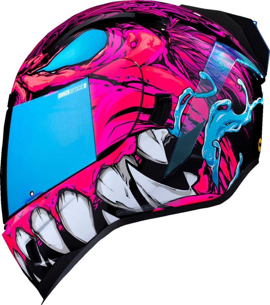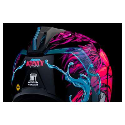 Airform™ Manik'RR MIPS® HelmetContinuous venting system Fog-free ICON Optics™ Shield with Rapid-Release™ System Injection molded polycarbonate shell for strength Internal airflow geometry Sculpted neck roll Prolock™ positive shield locking system Removable molded breath deflector The Dropshield™ visor must only be used while the main face shield is in the fully closed position Internal Dropshield™ with exterior switch Removable Hydradry™ 3-piece moisture wicking liner Internal speaker pockets work with ICON's R.A.U. Bluetooth device Includes Dark Smoke DropShield™ and Rubatone Black Speedfin™ Includes Clear & Blue RST Optics™ ShieldsSpeedfin™ includes Blue DayGlo Insert