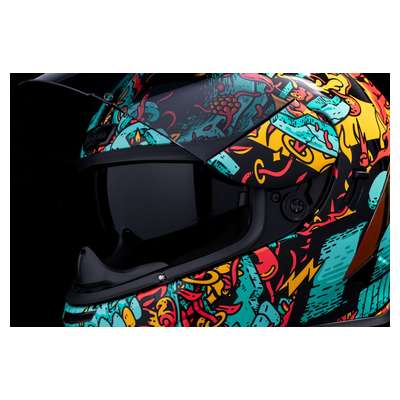 Airform™ Munchies MIPS® HelmetInternal airflow geometry Fog-free ICON Optics™ Shield with Rapid-Release™ System Injection molded polycarbonate shell for strength Sculpted neck roll Continuous venting system Prolock™ positive shield locking system Internal Dropshield™ with exterior switch The Dropshield™ visor must only be used while the main face shield is in the fully closed position Removable molded breath deflector Removable Hydradry™ 3-piece moisture wicking liner Internal speaker pockets work with ICON's R.A.U. Bluetooth device Includes Clear & Dark Smoke fog-free Optics™ shield