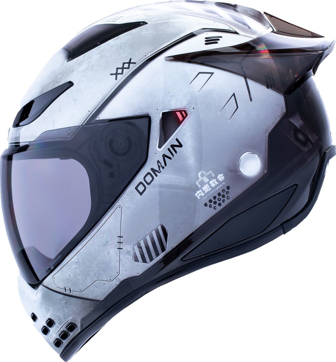 Domain™ Future Proof HelmetHandcrafted FRP shell for optimum strength with minimized weight Internal airflow geometry Removable molded breath deflector Fog-free Domain™ Shield with Rapid-Release™ System Continuous venting system Sculpted neck roll Removable Hydradry™ 3-piece moisture wicking liner Removable chin-curtain Includes Clear and Dark Smoke Domain™ shields Includes Dark Smoke Domain OTT Spoiler™ Upgradeable to HelmLink™ Bluetooth® communication system (sold separately)