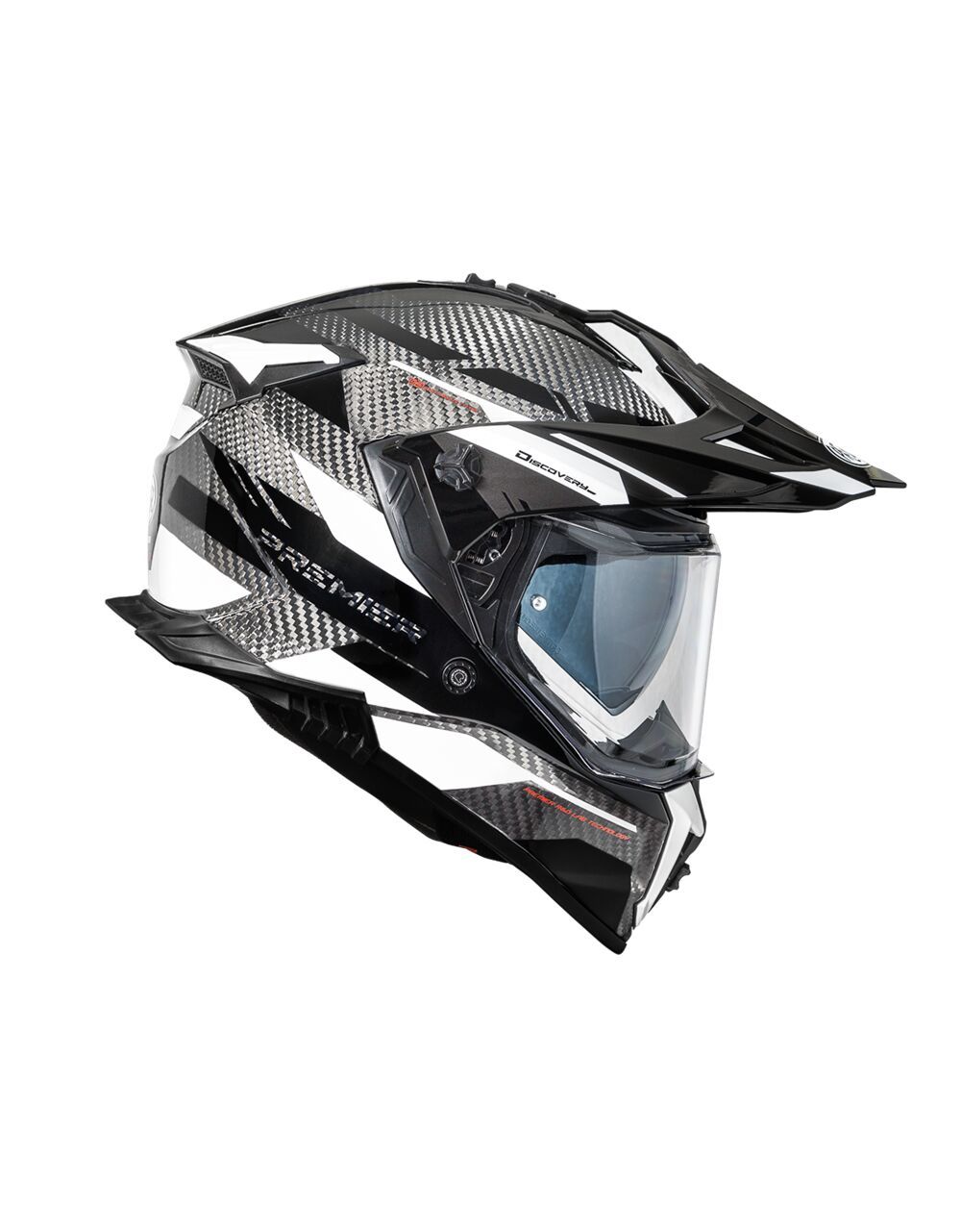 Discovery Carbon EA HelmetInner shell construction is EPS material allocated at different densities to disperse energy released in case of impact. Outer shell construction use two mould sizes to increase performance dependant on size, using carbon and aramid fiber combined with epoxy resin to make shell lightweight, elastic and resistant. Small shell sizes range from XS to M and larger shell size covers L to XXL. "Advanced Padding System" kit included with the helmet allows interior to be customized for better fit and comfort. Kit is made of breathable materials, is hypoallergenic and completely washable and removable. Micrometric closure allows quick release and is prepared for installation of Bluetooth® communication systems. Easy Fit system allows sufficient space for driving with prescription lenses. Optimal ventilation ensured thanks to large front intake, chin guard intake and extractors on the back. Scratch-resistant polycarbonate visor is also equipped with dark inner visor for optimal driving in all weather and light conditions, this visor is operated by lever on the left side of the helmet. Helmet is also equipped with a Pinlock® lens that can be mounted without any equipment. Specifically designed visor closure block on the chin guard is a special mechanism that with simple click makes the helmet quieter and safer even at high speeds.