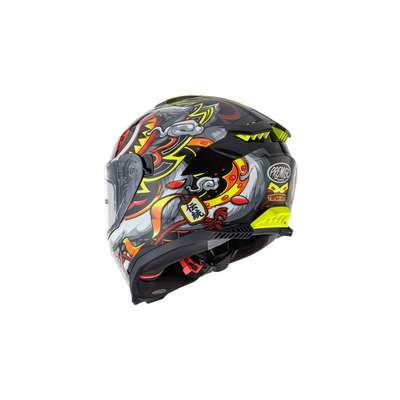 Typhoon LY Graphic HelmetThermoplastic outer shell construction uses two mould sizes to increase performance dependant on size chosen. Small shell covers sizes from XS to M, while larger shell covers sizes from L to XXL. Inner shell construction is EPS material allocated at different densities to disperse energy released un case of impact. Scratch-resistant polycarbonate visor with a special locking system, also has dark concealed inner visor allowing riding in all weather and light conditions. Visor is equipped with Pinlock® lens included which can be mounted comfortably without aid of equipment. Four element ventilation system consists of large air intake on front, one on the chin guard while two extractors on the back allow for optimal ventilation. "Advanced Padding System" kit included with the helmet allows interior to be customized for better fit and comfort. Thanks to the Easy Fit system the internal padding has been arranged to include sufficient space for eyeglasses. Equipped with micrometric chinstrap and is prepared for installation of Bluetooth® communication systems.