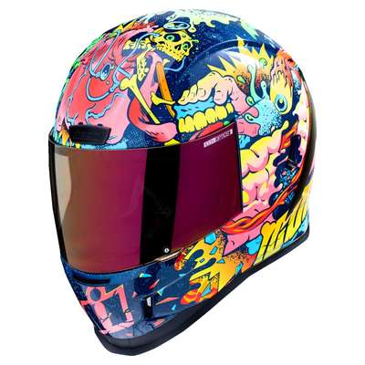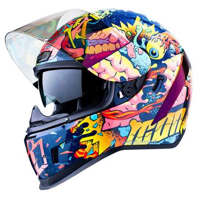 Airform™ Scatterbrain MIPS® HelmetInjection molded polycarbonate shell for strength Internal airflow geometry Continuous venting system Sculpted neck roll Fog-free Icon Optics™ Shield with Rapid-Release™ System Prolock™ positive shield locking system Internal Dropshield™ with exterior switch The Dropshield™ visor must only be used while the main face shield is in the fully closed position Removable molded breath deflector Removable Hydradry™ 3-piece moisture wicking liner Internal speaker pockets work with Icon's R.A.U. Bluetooth device Includes Dark Smoke Dropshield Includes Clear & RST Purple Optics Shield™