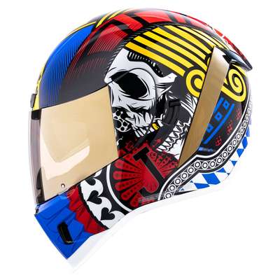 Airform™ Lucky Lid 5 MIPS® HelmetInjection molded polycarbonate shell for strength Internal airflow geometry Continuous venting system Sculpted neck roll Fog-free ICON Optics™ Shield with Rapid-Release™ System Prolock™ positive shield locking system Internal Dropshield™ with exterior switch The Dropshield™ visor must only be used while the main face shield is in the fully closed position Removable molded breath deflector Removable Hydradry™ 3-piece moisture wicking liner Internal speaker pockets work with ICON's R.A.U. Bluetooth device Includes Clear and RST Blue Optics Shield Includes Dark Smoke Dropshield™