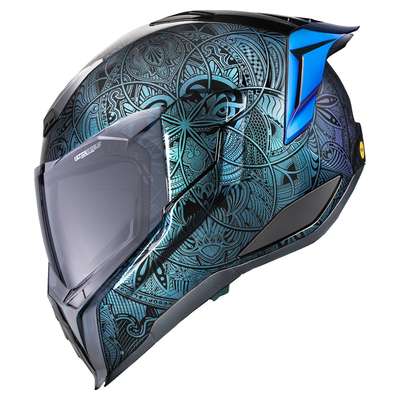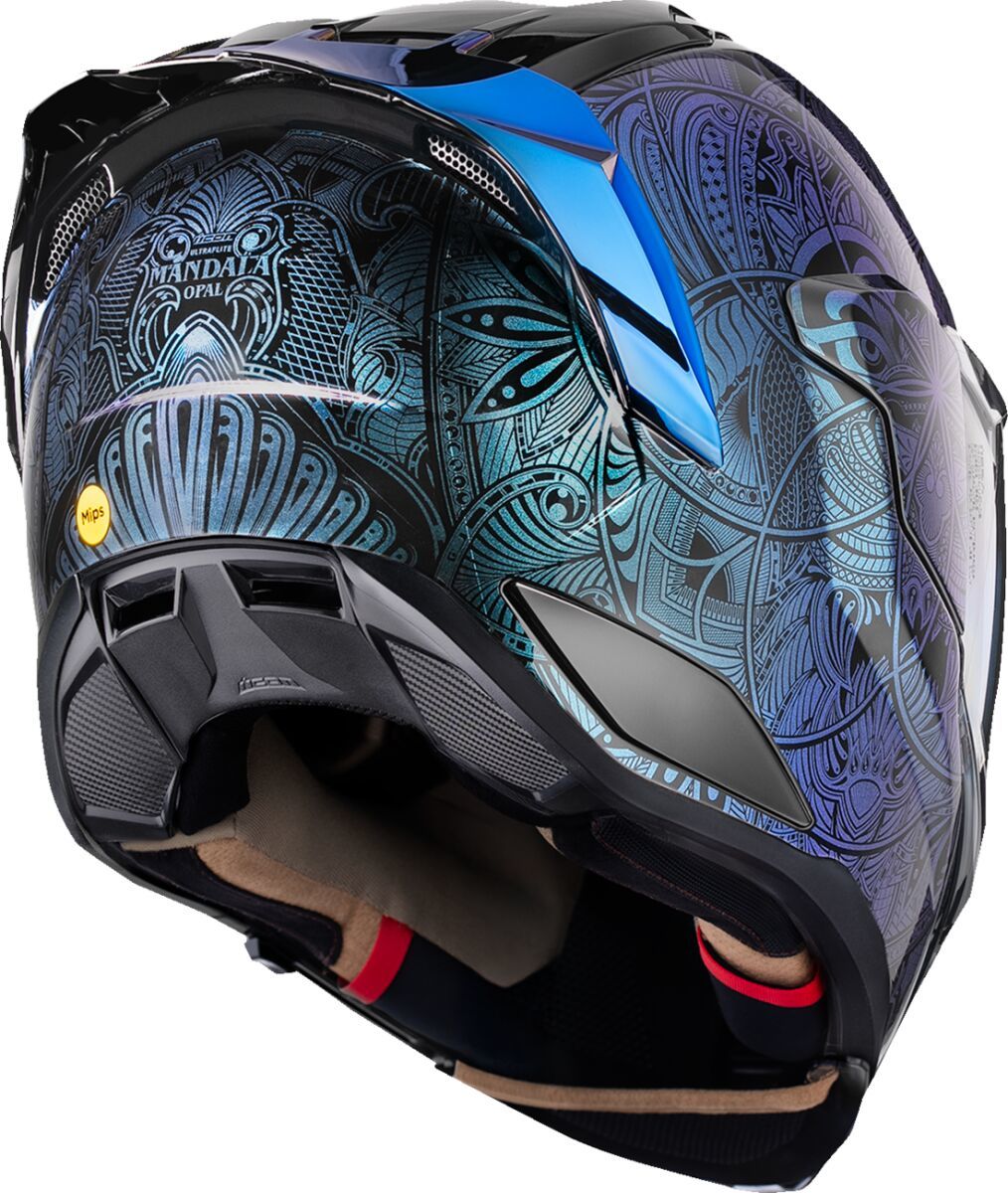 Ultraflite™ Opal Mandala MIPS® HelmetIntermediate-oval head-form fit Equipped with MIPS® safety system Handcrafted FRP composite shell for optimum strength with minimized weight Fog-free DropShield Ultra™ with exterior switch Premium comfort liner with moisture-wicking Hydradry™ and Ax®Suede for a custom fit Emergency Release cheek pads installed Multiple oversized intake and exhaust ports Quick-change fog-free Ultrashield™ with side plates Removable molded breath deflector and chin curtain Recessed twin channel supervent cooling system Includes clear Pinlock® prepared shield for added clarity in extreme conditions (Pinlock® insert lens sold separately) Upgradeable to HelmLink™ Bluetooth® communication system (sold separately) Includes dark smoke fog-free Ultrashield™ The Dropshield Ultra™ visor must only be used while the main face shield is in the fully closed position.