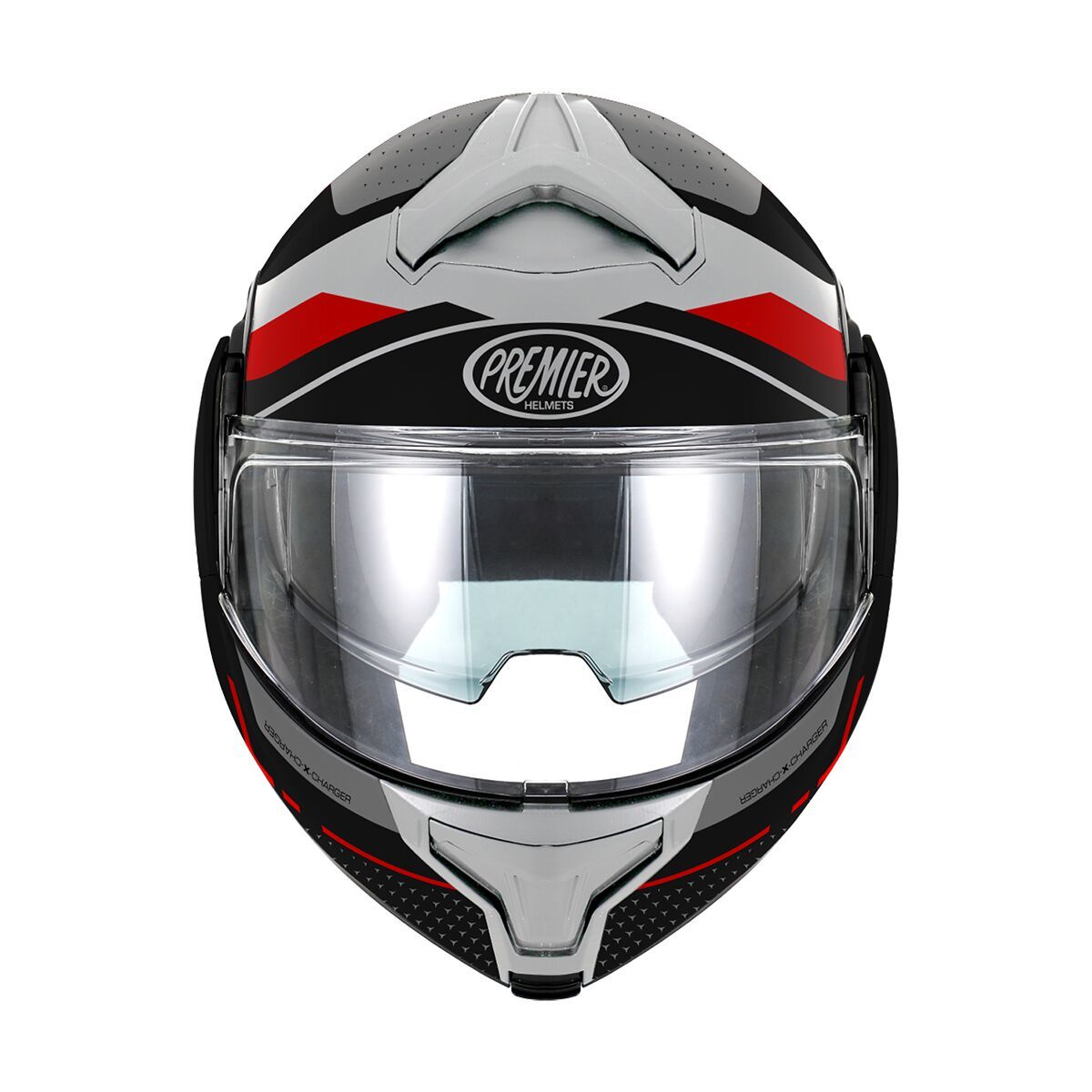 X-Charger HelmetHelmet representing an evolution of everyday modular helmets equipped with a fully rotating chin guard, that can be used in both open and integral configuration. Equipped with an integrated sun visor (Dark Smoke) easily operated via side control on the left side of the shell. Shell of the helmet is made of Advanced Polycarbonate offering strength and lightness, available in 3 shell sizes ensuring a perfect fit from sizes XS to 2XL. The advanced Polycarbonate shell has been designed to offer maximum lightness, comfort and precision in the fit thanks to the use of CAD technology. Designed to offer optimal balance and uniform weight distribution to ensure comfort during longer riding sessions. The visor is injection molded in transparent polycarbonate, and has an anti-scratch treatment that guarantees a long life. Helmet is also equipped with a Pinlock-ready visor to prevent foggin while riding, a Pinlock® lens comes standard with the helmet, and an internal sun visor. All Premier visors provide 99% UV-A and UV-B protection. The interior, in Sanitized fabric, is breathable, antibacterial and completely removable, ensuring freshness and hygiene in all conditions. The integrated grooves allows comfortable usage of prescription glasses or sunglasses with the helmet.
