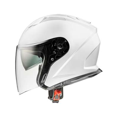 Dokker HelmetOuter shell construction is ABS thermoplastic material which is lightweight and safe in case of impact. Inner shell is made of EPS material with varying densities depending on zone ensuring perfect response to impacts. Main visor is transparent polycarbonate with scratch resistant treatment, designed to cover the whole face for protection from wind and dust. Second interior visor is dark for comfort against strong light, working like sunglasses. Relief present in the lower part, once raised causes the visor to disappear inside the shell. Two air vents in the top and extractor on the back ensure good ventilation. Interior of the helmet is designed to be comfortable, allows for wide view and feeling of freedom of movement. All interior are made hypoallergic by the Sanitized treatment while also being removable and washable. Micrometric safety strap makes the hook and release fast.