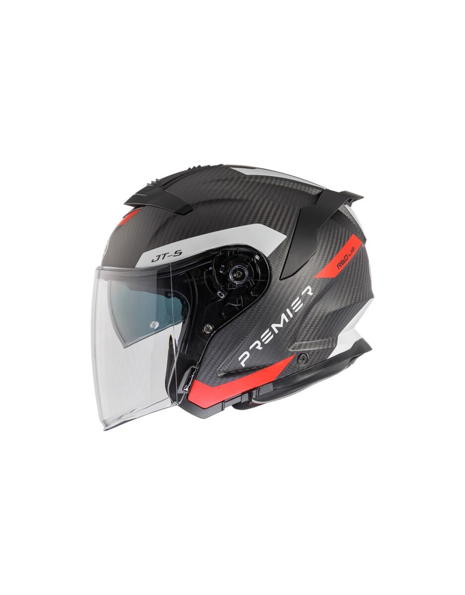 JT5 Carbon MA HelmetOuter shell construction is aramid carbon fiber combined with epoxy resin making the shell light, elastic and resistant to impacts. Inner shell is made of EPS material with variable density on different areas to ensure perfect response to shocks. Outer shell is produced in two mold sizes to perform better depending on the size required. Small shell covers sizes XS to M and larger shell covers L to XXL. Main visor is transparent polycarbonate which is anti-scratch treated, covering the whole face for protection from wind and dust. Inner visor is dark working like sunglasses in case of strong light. It is operated via lever present in the lower part, lowering or raising it inside the shell. Inner visor is also equipped with Pinlock® anti-fog system predisposition on the visor. Two air intakes on top and extractor on back ensure good ventilation. Interior has been designed for comfort, wide view and freedom of movement. All interiors are hypoallergenic by the Sanitized treatment which are removable and washable. Helmet is predisposed to the installation of Bluetooth® communication systems. Micrometric strap closure makes the attachment and release fast.