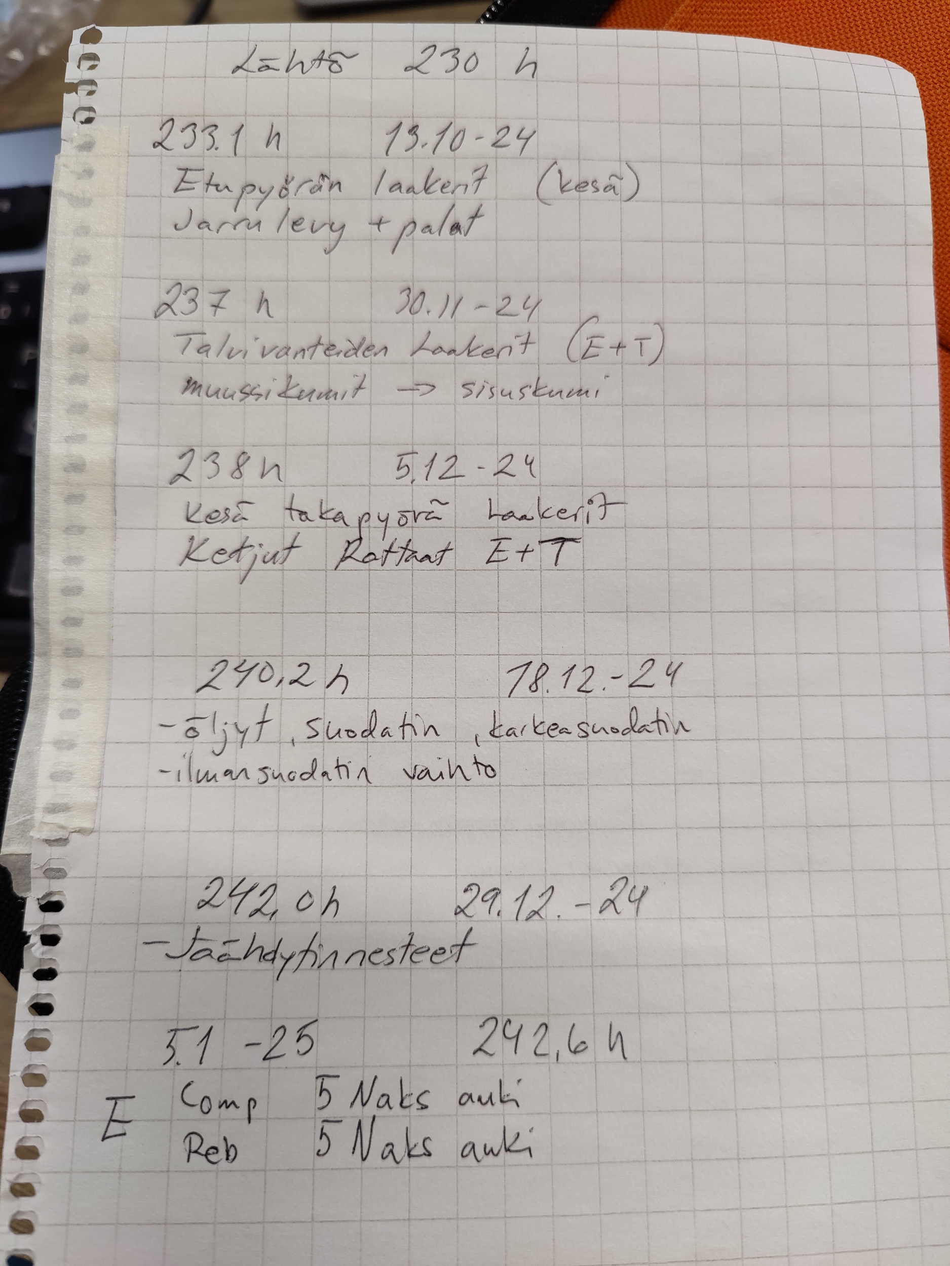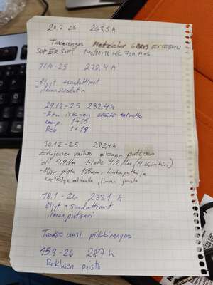 | Huoltohistoria: | Huoltohistoria hyvin tiedossa. -mäntä, jakoketju ja öljypumpunrattaat 150h -206h tehty laajempi rungon huolto -vaihdettu uudempi xplor keula, jossa esijännityksensäätö, -öljyt vaihdettu n5h välein |